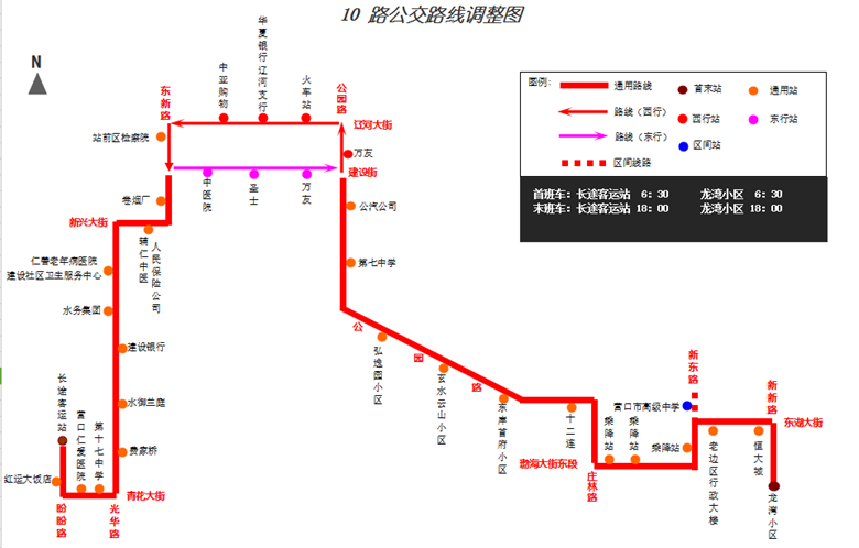 調(diào)整后:“龍灣小區(qū)”—東湖大街 —“乘降站”—新東路—原線—遼河大街/建設(shè)街—原線—盼盼路—“長(zhǎng)途客運(yùn)站”。